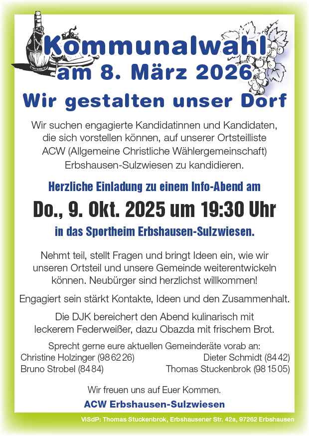 Mit Blick auf die Kommunalwahl 2026 hat die Allgemeine Christliche Wählergemeinschaft (ACW) Erbshausen-Sulzwiesen die Planung ihrer Wahlliste begonnen. Die Kandidatensuche läuft, interessierte Bürgerinnen und Bürger sind aufgerufen, sich zu melden oder gezielt angesprochen zu werden.
